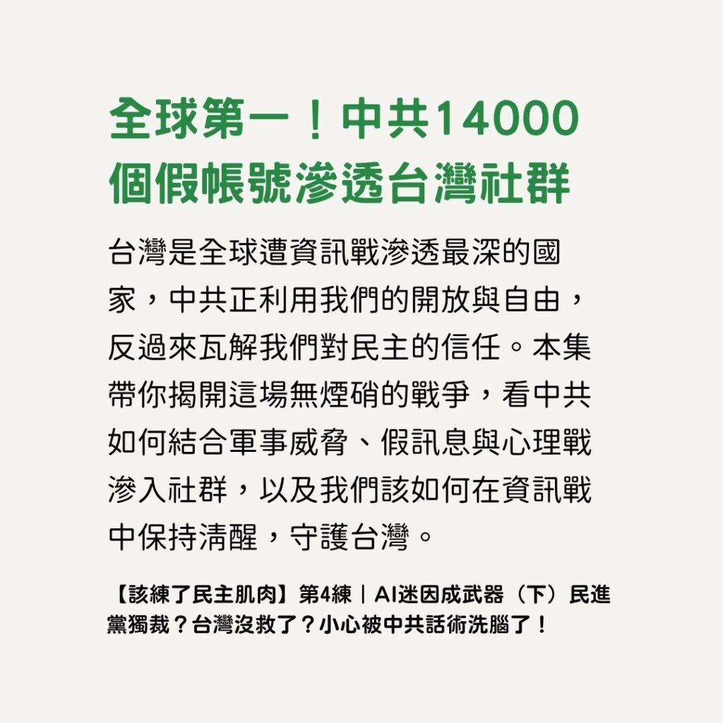 防衛方往往資源有限、只能被動闢謠,而攻擊方有長期預算、有計畫的操作。這也是為什麼「民主肌肉」需要持續練習。