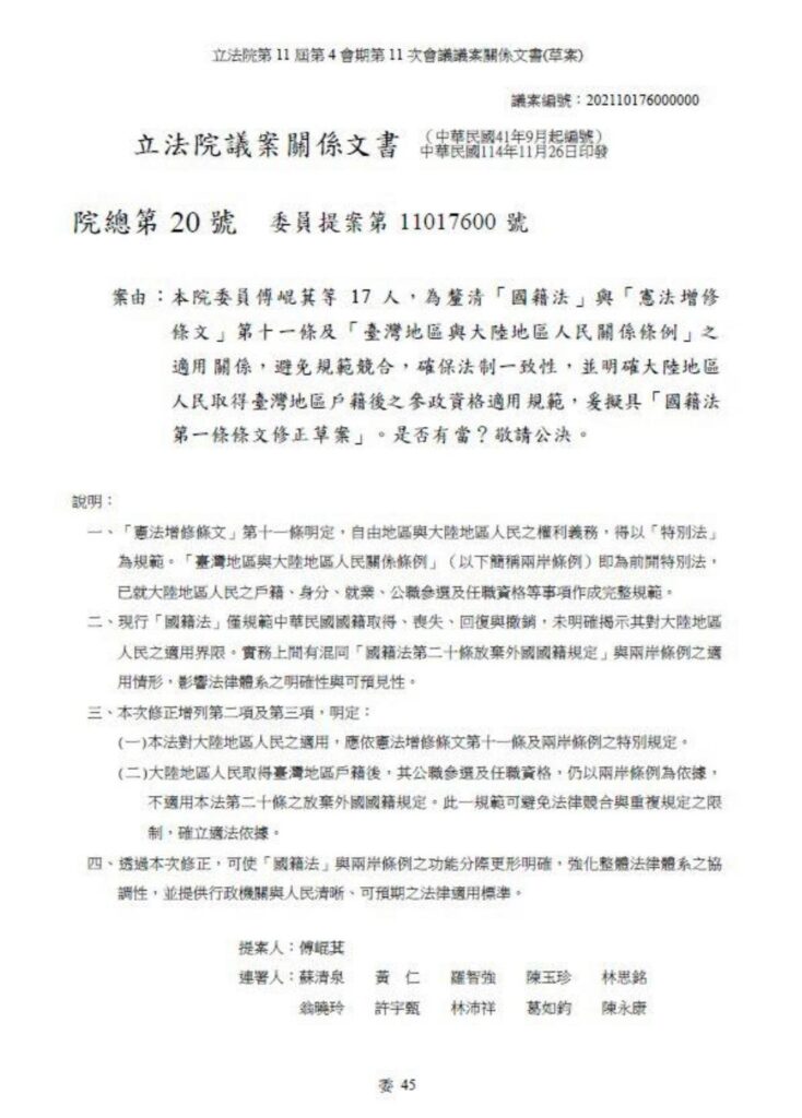國民黨立院總召傅崐萁提《國籍法》修正案,想把「大陸地區人民依法取得台灣戶籍者」排除在國籍法第 20 條之外,也就是說:已拿台灣身分證、但仍保有中華人民共和國國籍的中配,未來選村里長、議員等民選公職,可以不用像其他雙重國籍的人一樣,放棄原本的國籍。這案子預計在週五完成一讀付委。