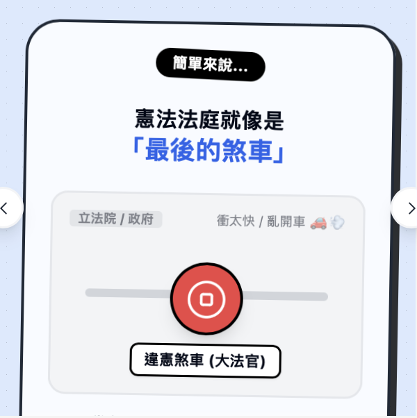 如果立法院通過的法律或政府、行政院的作為,超過憲法的界線,他們就能宣判違憲,幫不合法的法律或做法踩剎車。