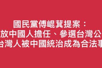 面對毀憲亂政的立院,國家危急時刻,身為普通人,我們到底可以做什麼? 看到國民黨傅崐萁提案:開放中國人擔任、參選台灣公職,想讓台灣人被中國統治成為合法事實的新聞後,有桌友留言問,身為普通人的我們,到底可以做什麼? Read more…